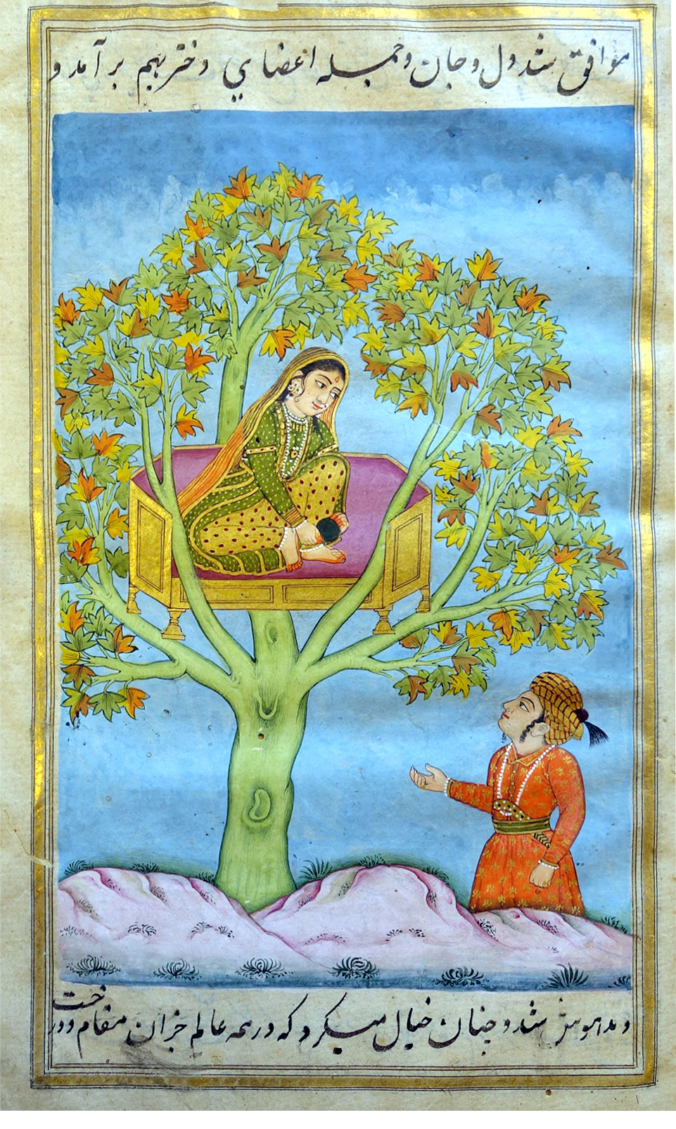 شاهزاده خانم مغرب عاشق شاهزادهی مشرق میشود که راهاش را به پای درختِ تکافتادهی دوردست پیدا کرده است، جایی که شاهزاده خانم در اسارت سیمرغ است. در اینجا شاهزاده خانم پیشواز و دوپَتا (لباس و شال زنان هندی) به تن دارد، در حالی که شاهزاده دستاری به سر بسته که قدری شبیه دستارهای صفوی است که همیشه ته شالشان را تو میدادهاند. قصهی قضا و قدر. کتابخانهی بریتانیا.