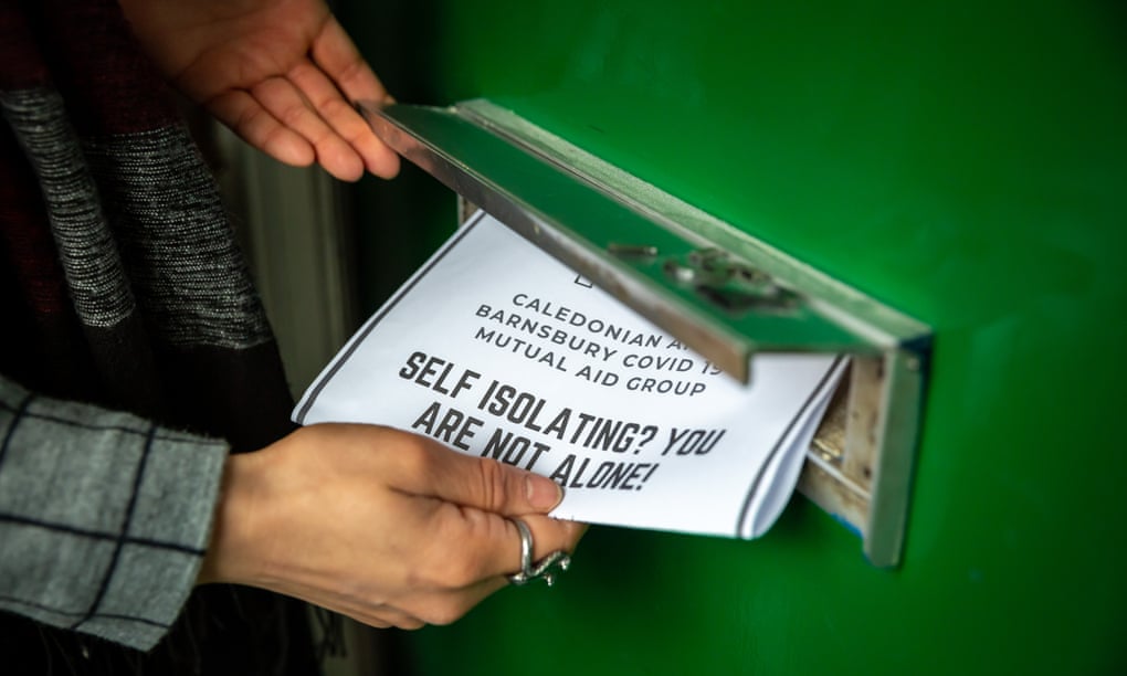 گروه کمک متقابل اعلان‌هایی را در ماه مارس در لندن در صندوق پستی می‌اندازد. عکس: جاناتان پروجا/ گاردین