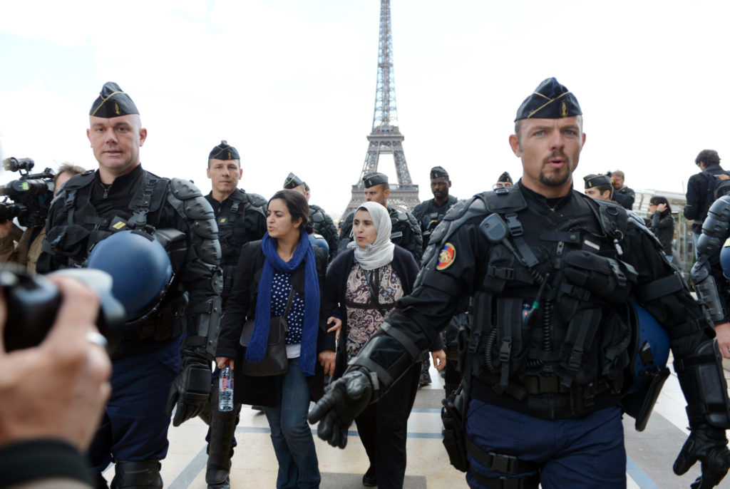 در ۲۲ سپتامبر سال ۲۰۱۲، پلیس سیار فرانسه زنان مسلمان را به یک مرکز کنترل هویت در میدان تروکادرو در پاریس میبرند. اریک ففربرگ. آرشیو عکس گتی.