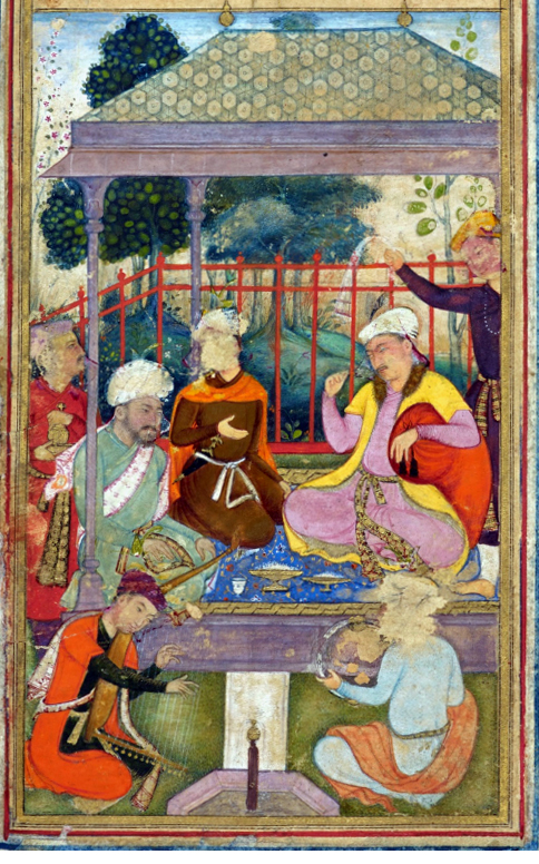 این تصویر با نقش نوازندههای نشسته در جلو و روبروی چند شخصیت نشسته بر سکوی سنگی زیر سایبان، در کُل با طیفِ داستانسرایی غزل همآهنگی دارد. مرد بالغ در سمت چپ احتمالاً حافظ است که با یکی از حامیان مالی جوان خود که در سمت راست نشسته و گویا مستغرق غمِ عشق است، حرف میزند.