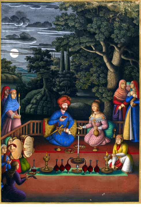 در ابتدا به نقاشیای میپردازیم (Grenville XLI, f.66v) که تصویری است از غزلی (با قافیهی مشترک در دو مصرع اول و بقیهی ابیات) از حافظ شیرازی (مرگ حدود ۱۲۰۲م)، یکی از برجستهترین غزلسرایان. هر چند این قطعه با لحنی شاد آغاز میشود اما در ادامه به تحلیل جنبههای مختلف وضعیت این دو دلداده میپردازد و به افسردگی میگراید. مصرع ۱، ۲ و ۶ این سِیر را ترسیم میکند: