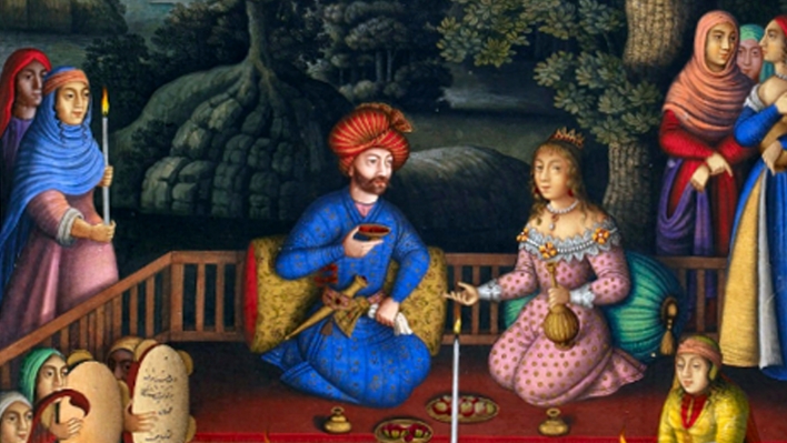 بعد از شرح مفصل بیدار شدن ترکتازی در باغی سحرآمیز، این مثنوی (قافیهی مشترک دو مصرع هر بیت) بهتدریج احساسات غالب در زمان ورود مسحورکنندهی ملکه و رخنمایی از چهرهی اروپایی (دقیقاً رومی) او را بازگو میکند. به دنبال تعارفهایی آمیخته با مهربانی، فضای عاشقانه ضیافتِ شراب و اردک (در تصویر با انار جایگزین شده) شور تازهای میگیرد. اینجاست که شاعر با ظرافت و استفاده از استعارههای موسیقایی آشنا غلیان احساسات و فضای عشرت و کامیابی را ترسیم میکند.