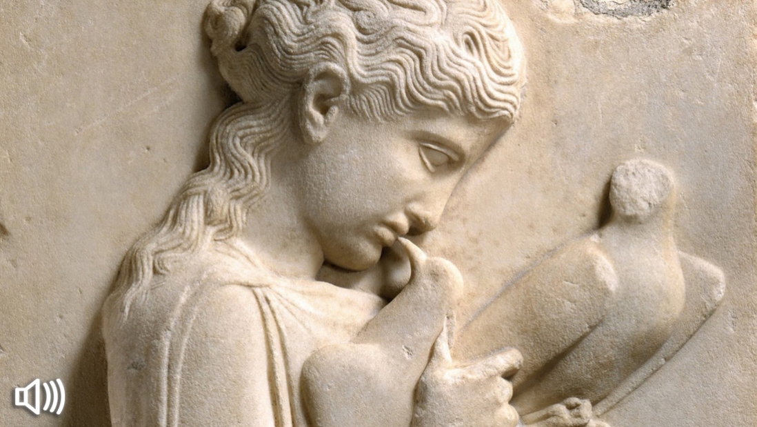 دختری کوچک و کبوترهایش، منقوش بر سنگ یابودی از مرمر، 450 تا 440 ق. م.، موزهی متروپولیتن نیویورک