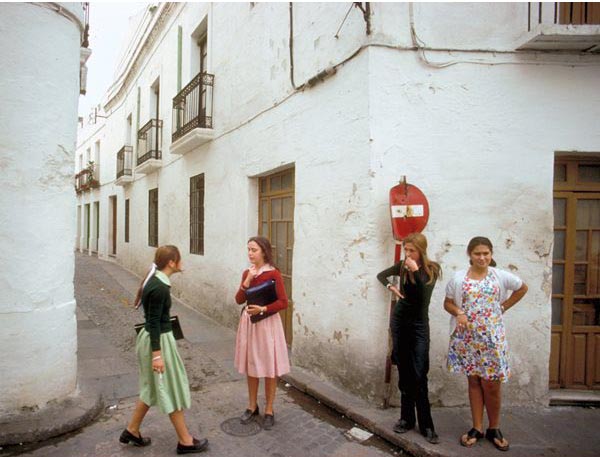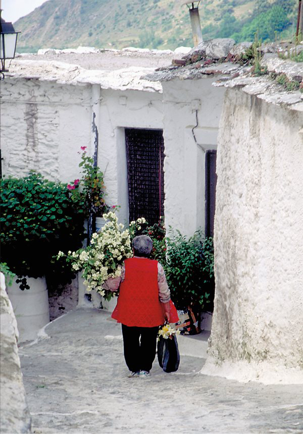 به نظرم من آدمی هستم که خیلی توی خط نیست، در مسیرهای پرتردد رفتوآمد نمیکنم. بنابراین وقتی دولت اسپانیا مسیرهای مسافرت به اندلس را برقرار کرد، رفتن به آنجا برای من مأموریت کاری ایدئالی بود. من خارج از بارسلون زندگی میکردم، و به من آزادی و فرصت لازم برای کشف جاهایی را داده بودند که خیلی توی چشم نباشد. این عکس در دهکده کوچک پامپانیرا در آلپوخاراس، منطقهی کوهستانی در ایالت گرانادا، برداشته شده است. مغربیها پس از اخراج از اسپانیا در همین جا مدتها دوام آوردند. زنی با یک دسته گل قدمزنان به سمت خانه میرود.