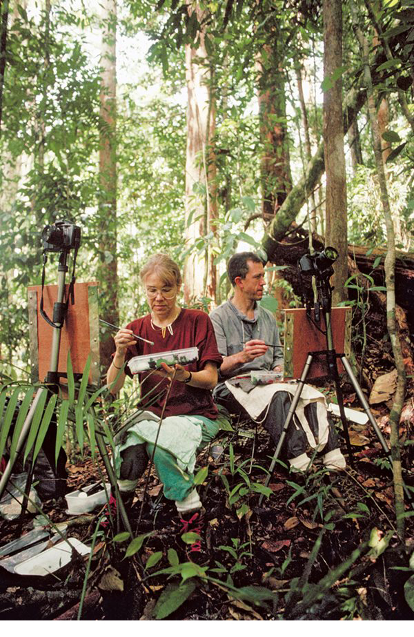 این عکسی است که در برونئی، کشور کوچکی در جزیرهی بزرگ بورنئو، برداشته شده است. این یکی از بکرترین جنگلهای بکر استوایی است. تصویر دو دانشمند نقاش است که جزئیات اشیائی را که میبینند نقاشی میکنند. معلوم است که اینجا جایی نیست که شما جدا از جمع راه خودتان را بگیرید و بروید. میدانستم که در این منطقه در هر متر مربع یا کیلومتر مربع بیش از هر جای دیگری در دنیا مار هست. در تمام مدتی که در آنجا بودم در جستوجوی مارها بودم. نه فقط چون میخواستم یک مار ببینم، بلکه به این دلیل که شما هرگز نمیدانید که چه مارهایی میتوانند به شما صدمه بزنند. در این مدت من حتی دم مار هم ندیدم. به نظرم یک هفته آنجا بودم.
