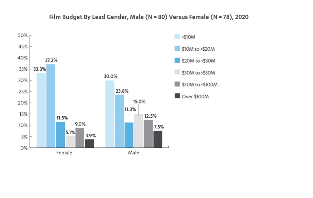 بودجهی فیلمها بر اساس جنسیت بازیگر اصلی، مرد (80 فیلم) در مقایسه با زن (78 فیلم)، سال 2020
