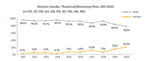 بر اساس این گزارش، آمار کارگردانان زن از 29 درصد در سالهای ۱۸-۲۰۱۷ به ۳۳ درصد در سال 2019 افزایش یافت. در زمینهی نقشهای اصلی پشت صحنه هم، ۱۶ درصد از کارگردانان ۱۰۰ فیلم پرفروش سال ۲۰۲۰ را زنان تشکیل میدادند. این رقم در مقایسه با آمارهای ۱۲ درصدی و 4 درصدی، به ترتیب، سالهای ۲۰۱۹ و ۲۰۱۸ حاکی از رشدی چشمگیر است.
