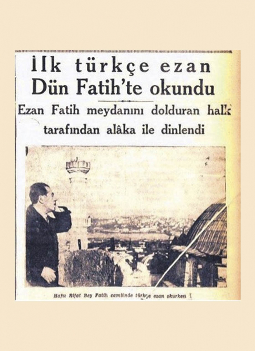 با وجود این، اذان عربی باقی ماند تا با سقوط امپراتوری عثمانی و تأسیس جمهوری ترکیه در سال ۱۹۲۳ برچیدن نمادهای اسلامی از ترکیه نوین آغاز شود. در ماده‌ی سوم «لایحه‌ی اصلاحات» که در سال ۱۹۲۸ توسط اسماعیل حکی در دانشگاه دارالفنون استانبول تهیه شد تا در شورای دانشکده‌ی الهیات بررسی شود، آمده بود: «زبان عبادت باید ترکی باشد. ترجمه‌ی ترکی آیات، دعا و خطبه را باید پذیرفت و استفاده کرد.» آتاتورک و هم‌فکرانش ایده‌ی اصلی این تغییرات را «عبادت با زبانی که می‌فهمید» می‌نامیدند. این تغییر زبان عبادت از عربی به ترکی یادآور ترجمهی کتاب مقدس توسط لوتر از لاتین به آلمانی بود که یکی از مهمترین مشخصات پروتستانیسم و اصلاحات دینی در جهان مسیحیت به شمار می‌رود.