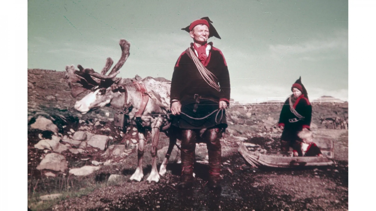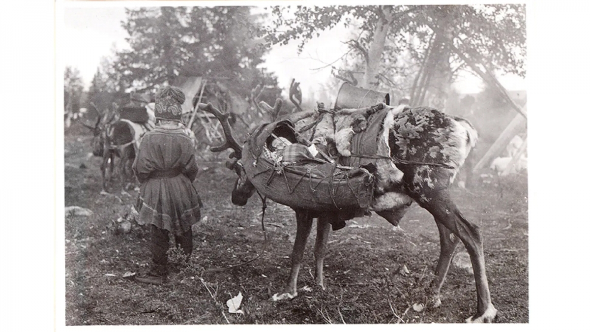 همان‌طور که در این تصویر از دهه‌ی 1940 می‌بینیم، در گذشته کودکان سامی و خانواده‌هایشان همراه با گله‌ی گوزن‌های شمالی به شکل گسترده‌ای به این سو و آن سو می‌رفتند. عکس: سازمان میراث فرهنگی فنلاند