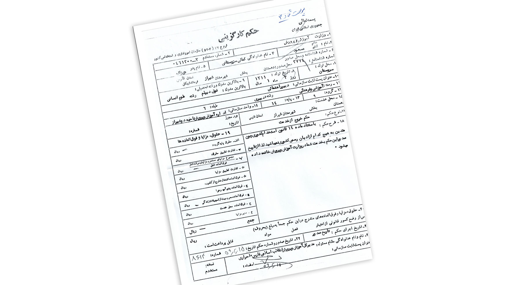 این «حکم خاتمه» با عنوان «مدیر کل آموزش و پرورش انقلاب اسلامی فارس» به امضای آقای احراری رسیده بود. بعد از مدتی نسخهای از «حکم خروج از خدمت» با امضای رئیس ادارهی آموزش و پرورش ناحیهی ۲ شیراز به نشانیِ خانهی ما ارسال شد که خواهان اعلام وصول حکم خروج از خدمت بود.