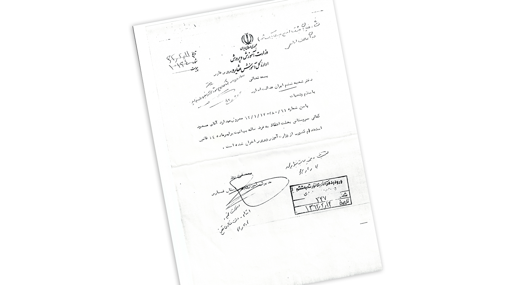 در تاریخ ۸۰/۵/۲۴ از رئیس کارگزینیِ کل ادارهی آموزش و پرورش پاسخی دریافت کردم مبنی بر این که چون اخراج شدهام کاری نمیتوان کرد! این بار همسرم به این نامه پاسخ داد تا درخواست ۲۱ سال گذشته را تکرار کند. این مسئلهای نبود که بتوان با گذشت زمان آن را به فراموشی سپرد بلکه هر لحظه در سینهی تاریخ ماندگارتر میشد. هنگامی که آقای خاتمی در اوایل سال ۸۰ به شیراز آمدند، نامهای توسط همسرم به ایشان تقدیم شد و متعاقب آن نامهی دیگری برای پیگیری به دیوان عدالت اداری فرستاده شد.
