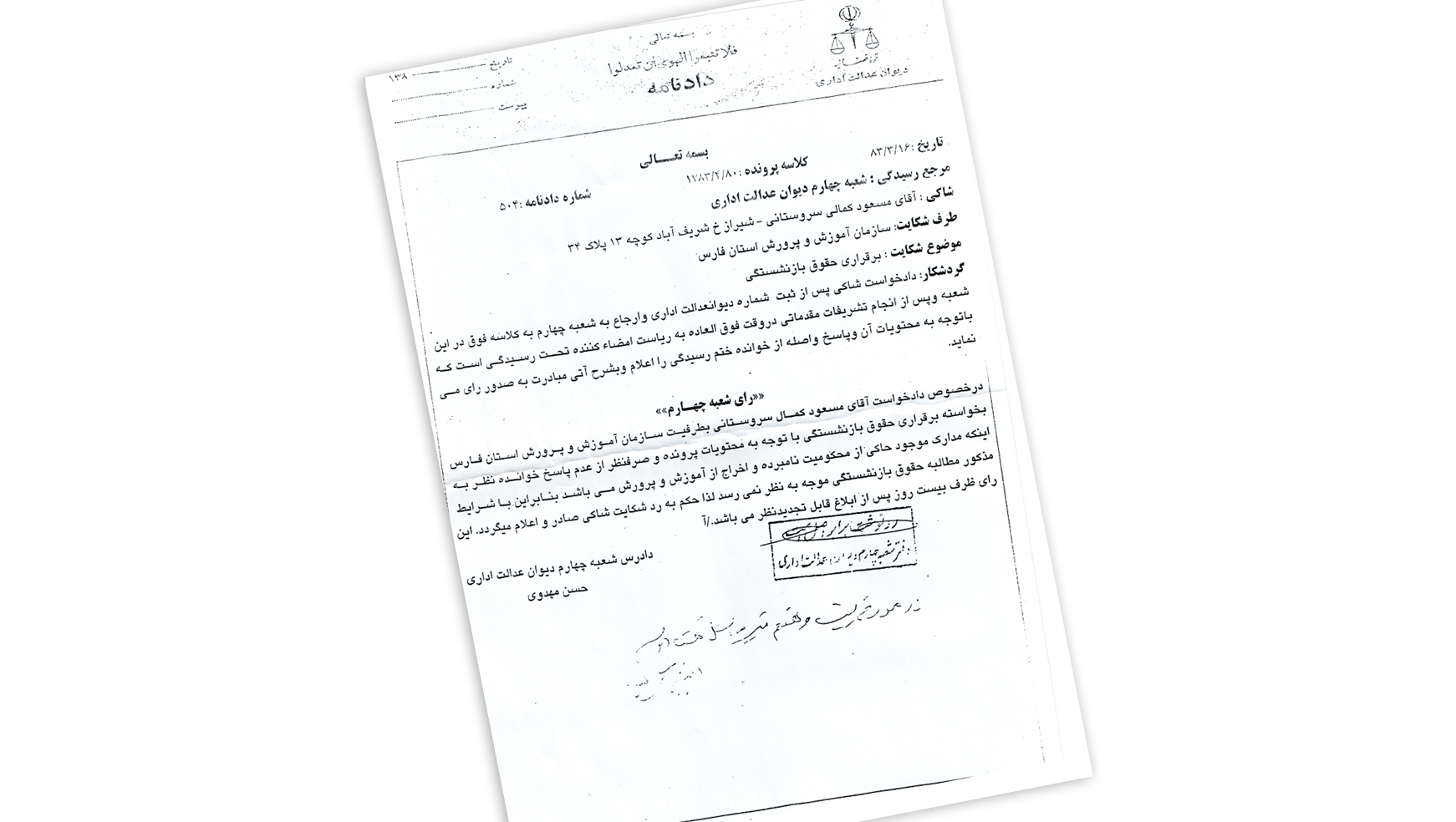 سرانجام شعبهی چهارم دیوان عدالت اداری در تاریخ ۸۳/۲/۱۶ نتیجهی رسیدگی به شکایتم را اعلام کرد: «مطالبهی حقوق بازنشستگی موجه به نظر نمیرسد.» نوشته بودند که مدارک موجود حاکی از محکومیتِ من و اخراج از آموزش و پرورش است! به چه جرمی محکوم شده بودم؟ عقیده و باورم؟