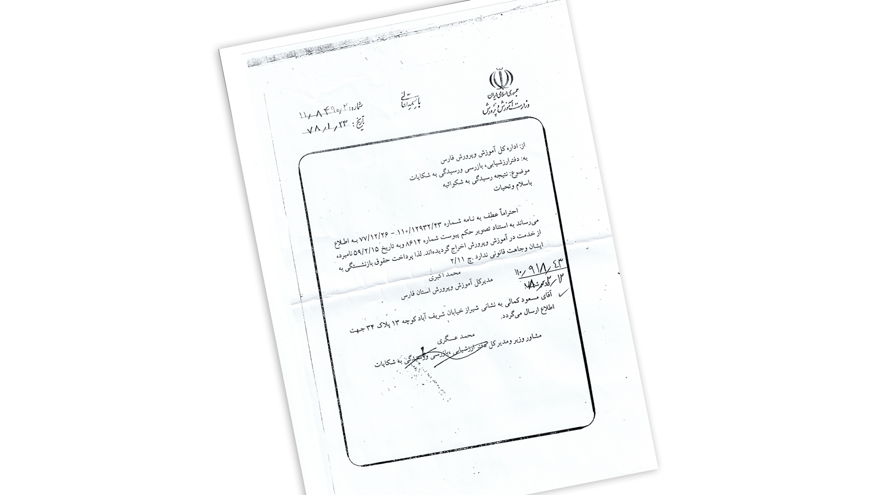 از نهادهای مسئول رسیدگی به تخلفات اداری و هیئت تجدیدنظر وزارت آموزش و پرورش نیز درخواست کردم که به شکایتم رسیدگی کنند و پروندهی بسته را بگشایند و حقوق ازدسترفته را بازگردانند. در آن زمان، قانون جدیدی تصویب شده بود که بر اساس مادهی یازدهی آن هر کارمند اخراجیای که ۲۵ سال سابقهی خدمت یا ۵۰ سال سن داشت، میتوانست از حداقل حقوق کارکنان دولت استفاده کند. با توجه به مطابقت مفاد این قانون با شرایط خود، خواهان دریافت حداقل حقوق کارکنان دولت بودم. هیئت تجدیدنظر رسیدگی به تخلفات، درخواستم را نپذیرفت اما این بار کتباً به من پاسخ داد و مرا «کارمند سابق آموزش و پرورش فارس» خواند.