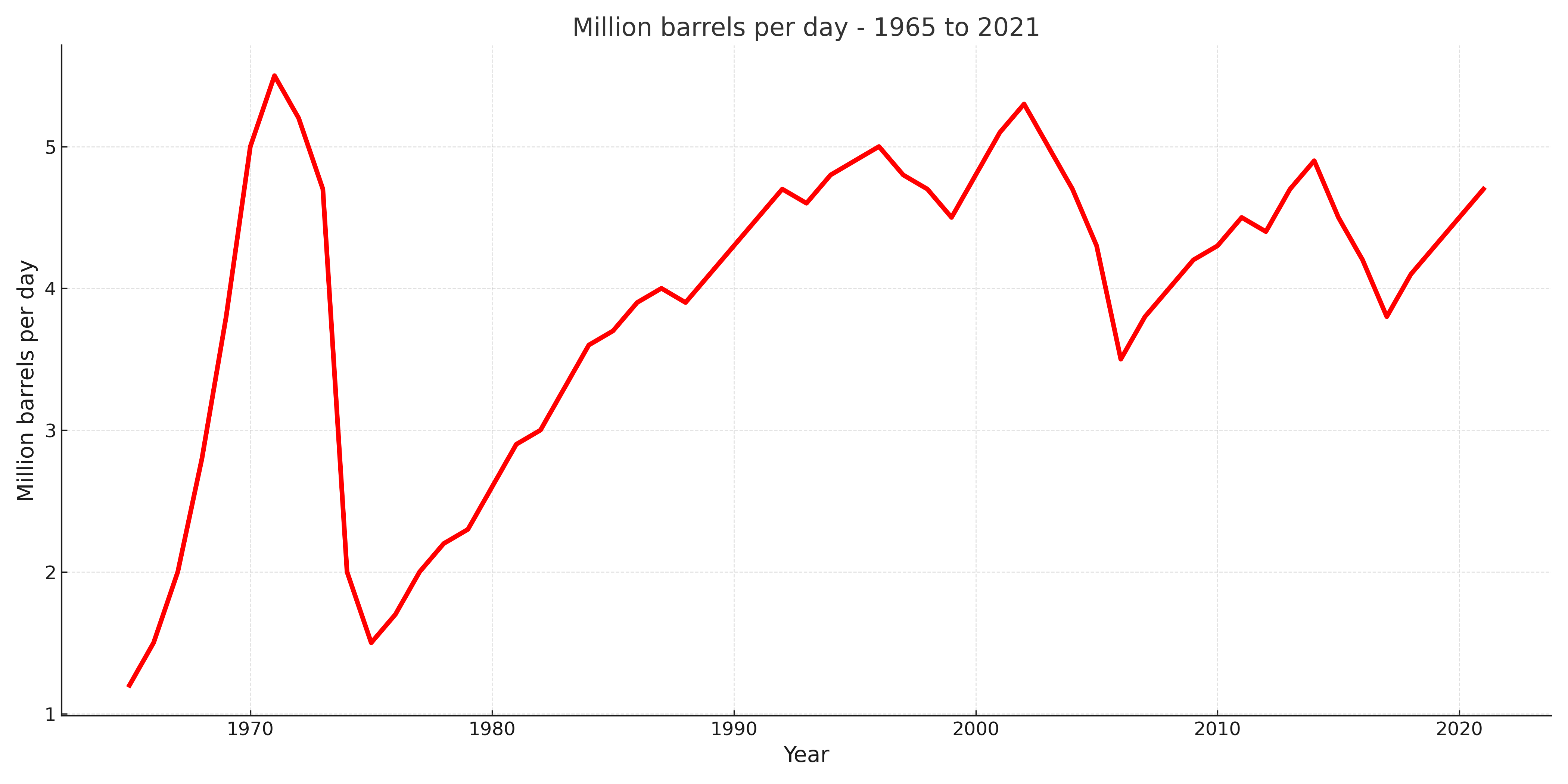 یکی از نمونههای مهم در این زمینه، صنعت نفت ایران است. در دههی ۱۳۵۰ و پیش از انقلاب ۱۳۵۷، ایران یکی از بزرگترین تولیدکنندگان نفت در جهان بود و در سال ۱۳۵۳ (۱۹۷۴ میلادی)، با تولید بیش از ۶ میلیون بشکه در روز، بیش از ۱۰ درصد از تولید جهانی را به خود اختصاص داده بود (نمودار زیر و گزارش EIA آمریکا، ۲۰۲۳). این موقعیت مسلط، عمدتاً ناشی از ذخایر عظیم نفتی و شرایط مناسب استخراج بود که برای ایران نوعی «مزیت مطلق» در تولید نفت فراهم کرده بود.