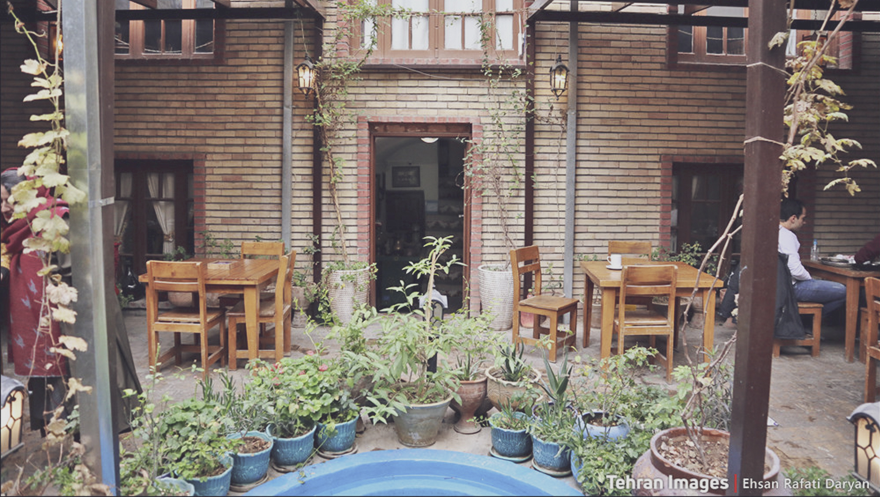 از لای درِ قدیمی که میگذری، حوض آبی رنگی با کاشیهای کوچک به مشتریان خوشامد میگوید. در کنار حوض چند درخت کاج بزرگ حاکی از قدمت بناست. دیوارهای آجریِ قرمزرنگ آدم را پرت میکند به گذشتهی دور. حاشیهی دیوار باغچهای است پر از گلهای شمعدانی. دور تا دور حوض و زیر چترهای بزرگ، میزهای کوچک و بزرگی مرتب چیدهاند، که همه پر است و جا برای نشستن در این حیاط دنج نیست. دختران و پسران جوان در جمعهای سه چهار نفری پشت میزها مشغول گپ و گفت هستند. در آن سوی این محیط نسبتاً شلوغ از پنجرهی ساختمان قدیمی قفسههای کتاب دیده میشود. اینجا یکی از کافه کتابهای تهران است.