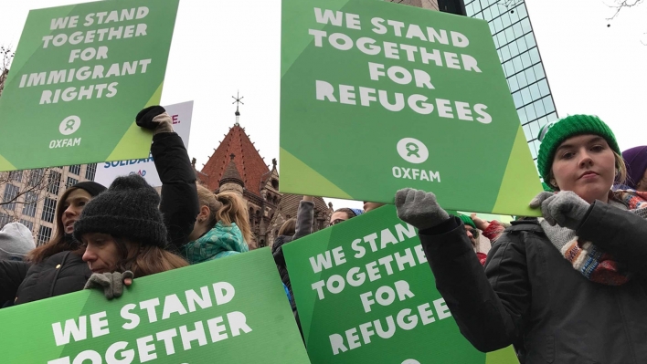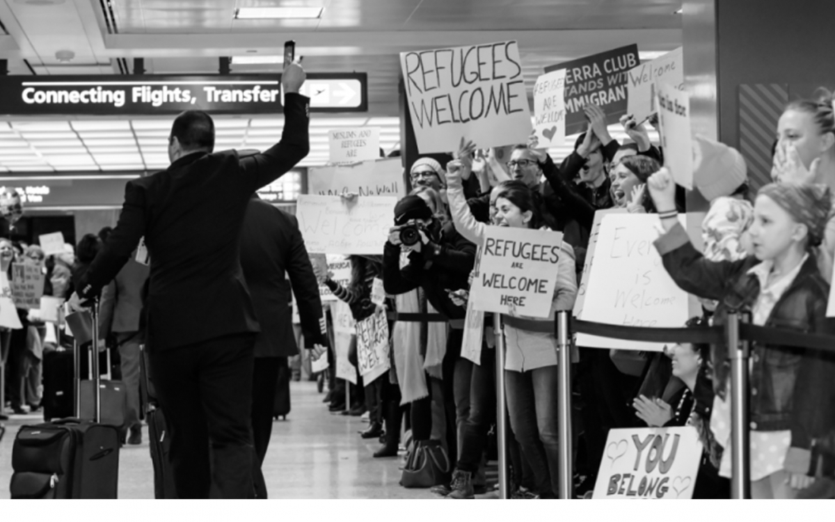 «خوشآمدگویی به مهاجران»، عکس از فرودگاه دالس در ویرجینیا، ازدحام جمعیت معترضان به فرمان اجرایی دولت ترامپ در مورد ممنوعیت سفر اتباع هفت کشور به آمریکا. عکاس، جف لوینگستن.