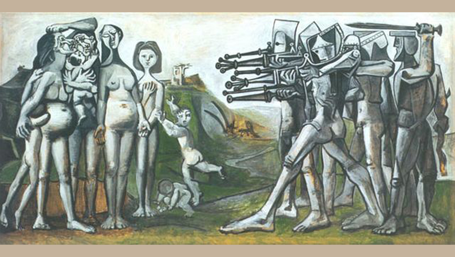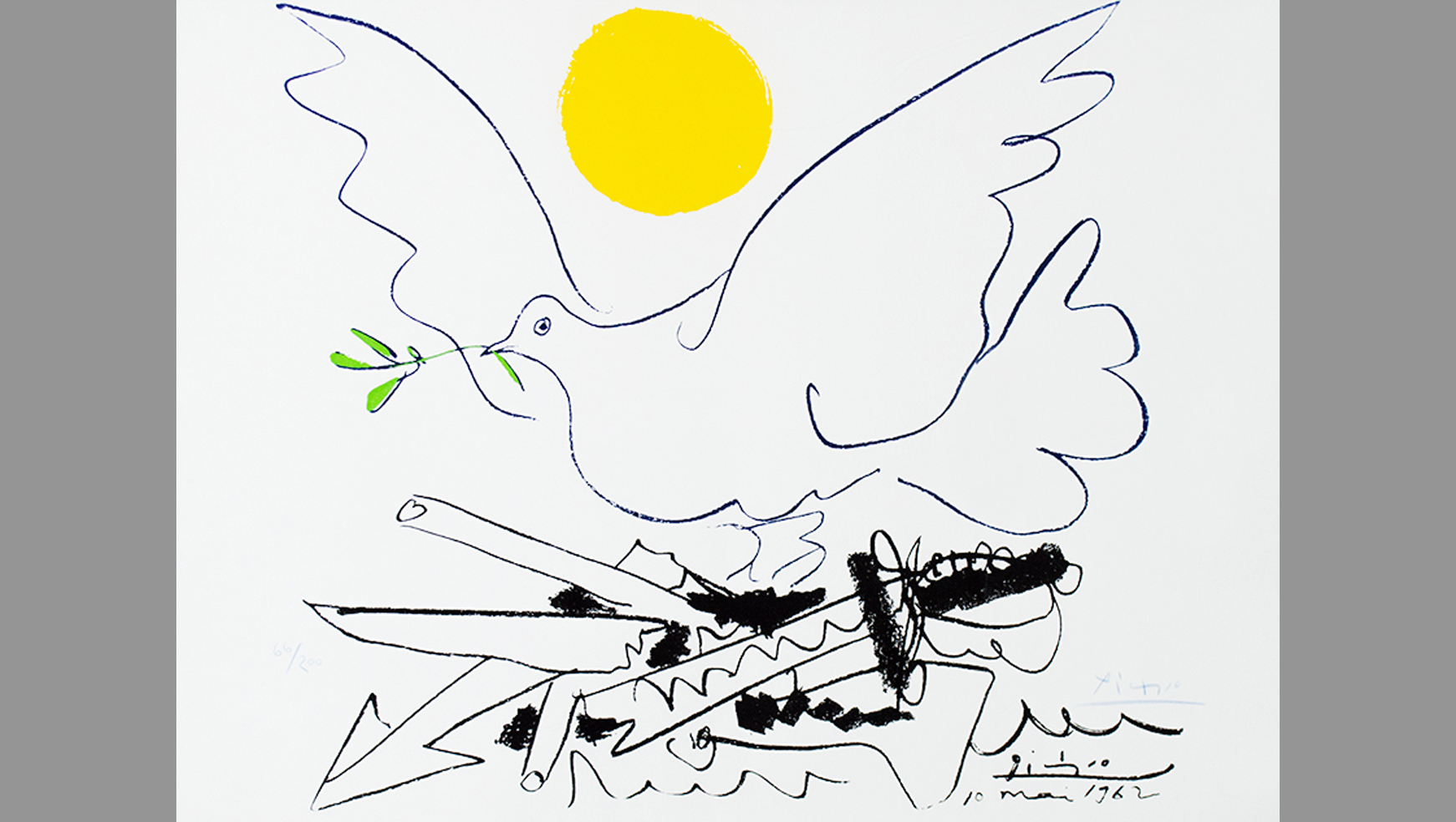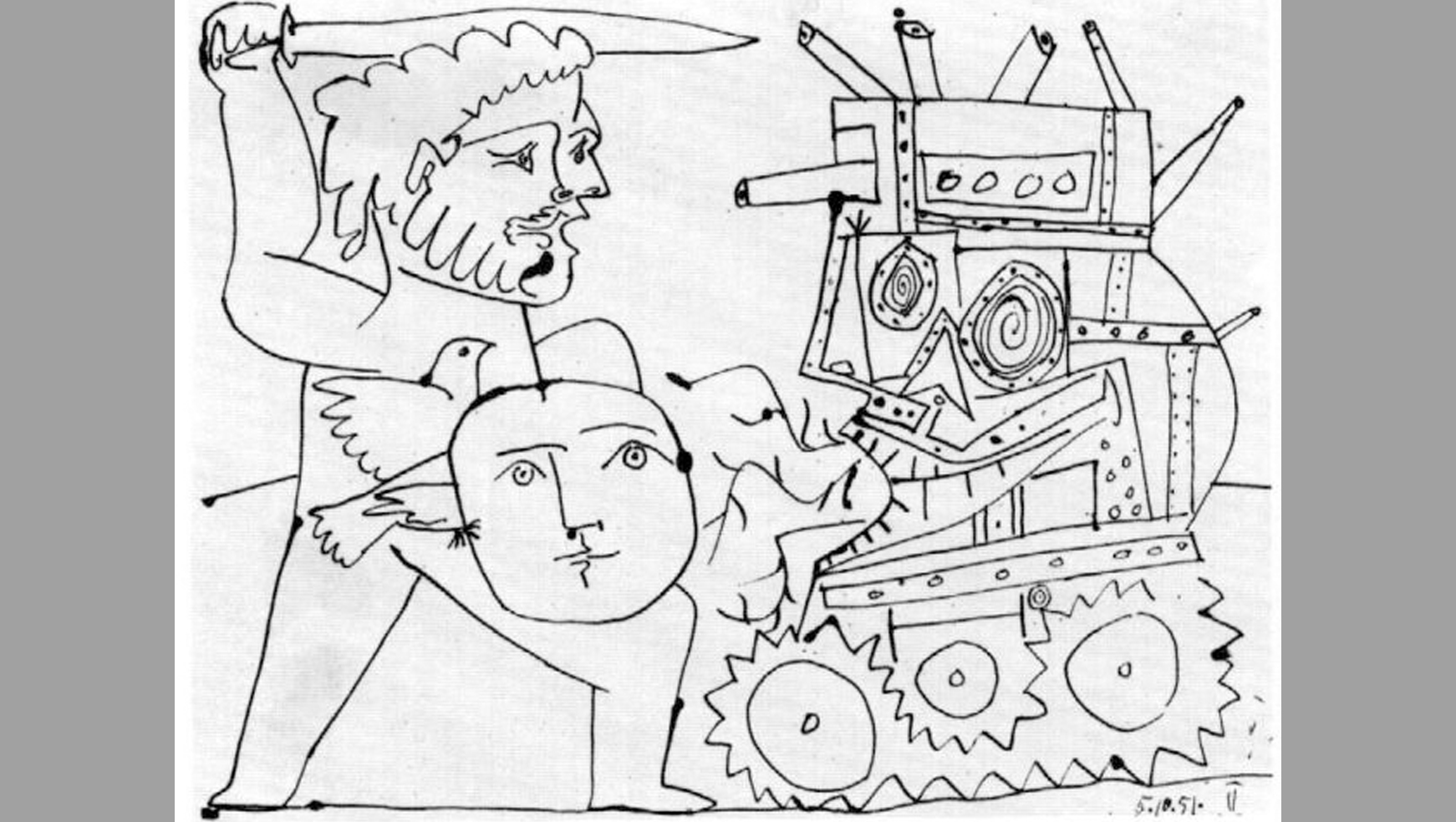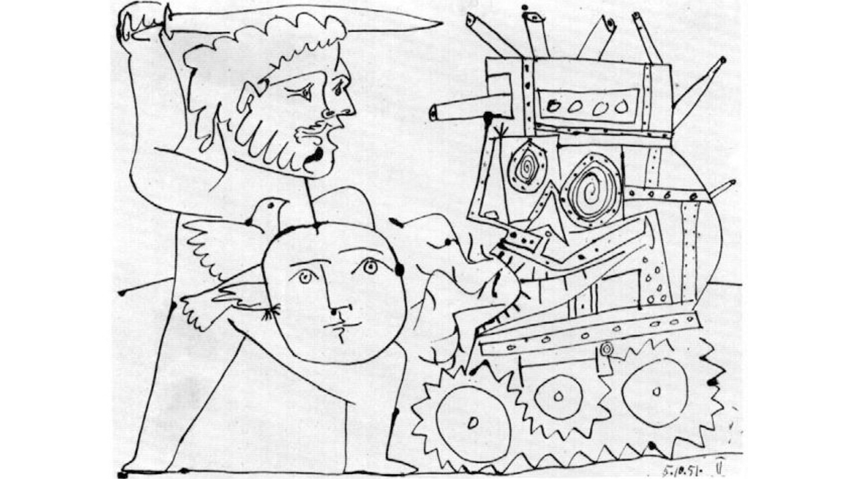 پابلو پیکاسو یکی از برترین و تأثیرگذارترین هنرمندان قرن بیستم، از سیاسی‌ترین هنرمندان نسل خود بود و بخش مهمی از زندگی و هنر خود را وقف اعتراض به جنگ و تلاش برای عدالت و صلح جهانی کرد. پیکاسو طرح‌ها و نقاشی‌های بسیاری (بیش از صد طرح اولیه یا اثر کامل) با موضوع جنگ و صلح از خود بجا گذاشته که معروف‌ترین آن‌ها نقاشی گرنیکاست. گرنیکا نام شهر کوچکی در شمال اسپانیا است که در جنگ‌های داخلی اسپانیا، هواپیما‌های آلمان نازی به حمایت از ژنرال فرانکو آن را بمباران کردند، و نقاشی پیکاسو تصویری از فجایع این بمباران‌ است.