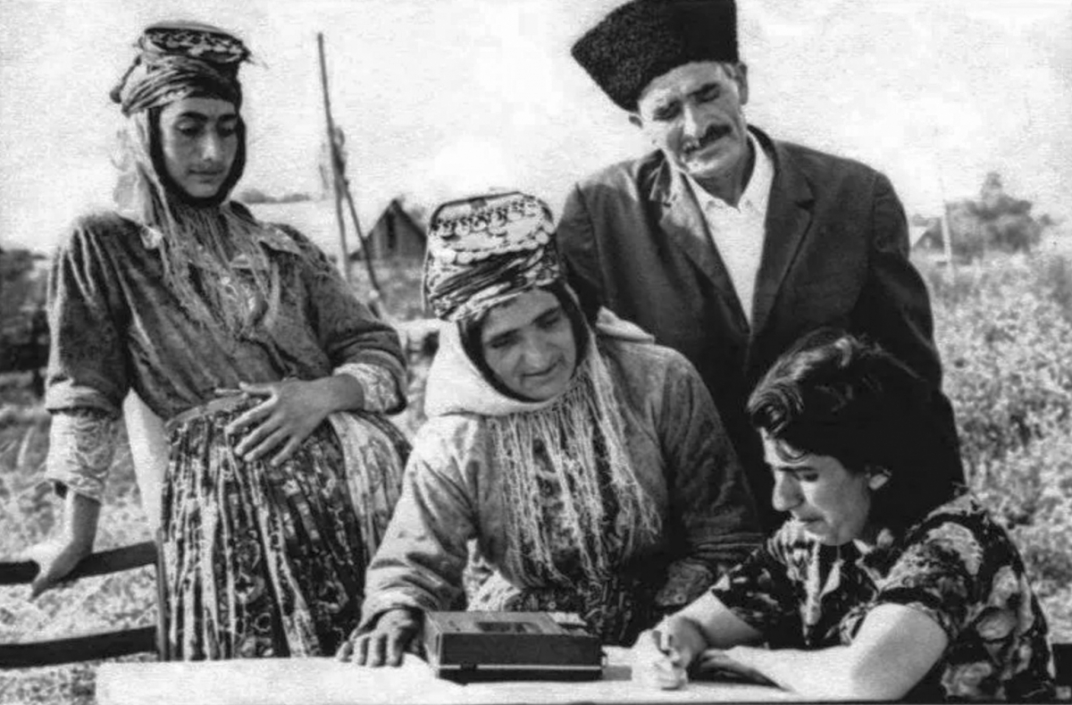 جمیله جلیل (دختر جاسم جلیل) در حال ضبط میدانی برای رادیو ایروان، در روستایی در منطقهی ماسیس در ارمنستان. اواسط دههی ۱۹۷۰